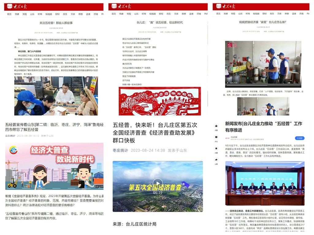 线上做强宣传矩阵。在区政府网站和AI台儿庄APP上开通了五经普专题专栏,并给6处镇街开通上传功能,刊发五经普相关知识、政策、法规、工作动态等内容,增加专栏信息汇聚,形成宣传规模,截至目前两平台已聚汇五经普信息200余篇。同时,积极与区委宣传部对接,动员全区镇(街)及区直部门负责转载发布相关公众号内容,集中宣传月以来,转发相关稿件数百篇,累计阅读量十余万次,充分发挥宣传阵营作用。融媒体制作“主播说新闻”6期,营造良好普查氛围。建立镇街各主要分管领导在内的五经普工作推进群、镇街及区直成员单位在内的五经普工作宣传群及素材报送群,有效掌握五经普工作进展。区经普办安排专人负责每日巡街、调度成员单位经普宣传落实情况,并将调度情况纳入《五经普工作通报》,有效督促经普宣传工作落实。