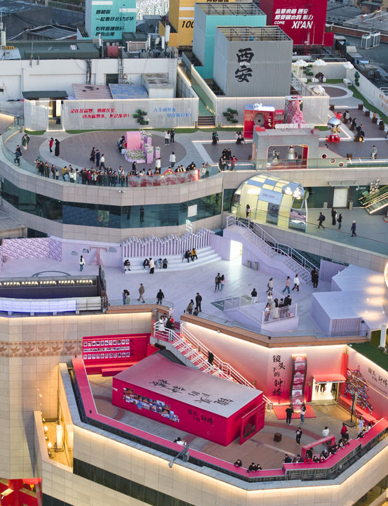 2025年3月19日,游客在西安开元商城观景平台上拍照游玩(无人机照片)。新华社记者 邵瑞