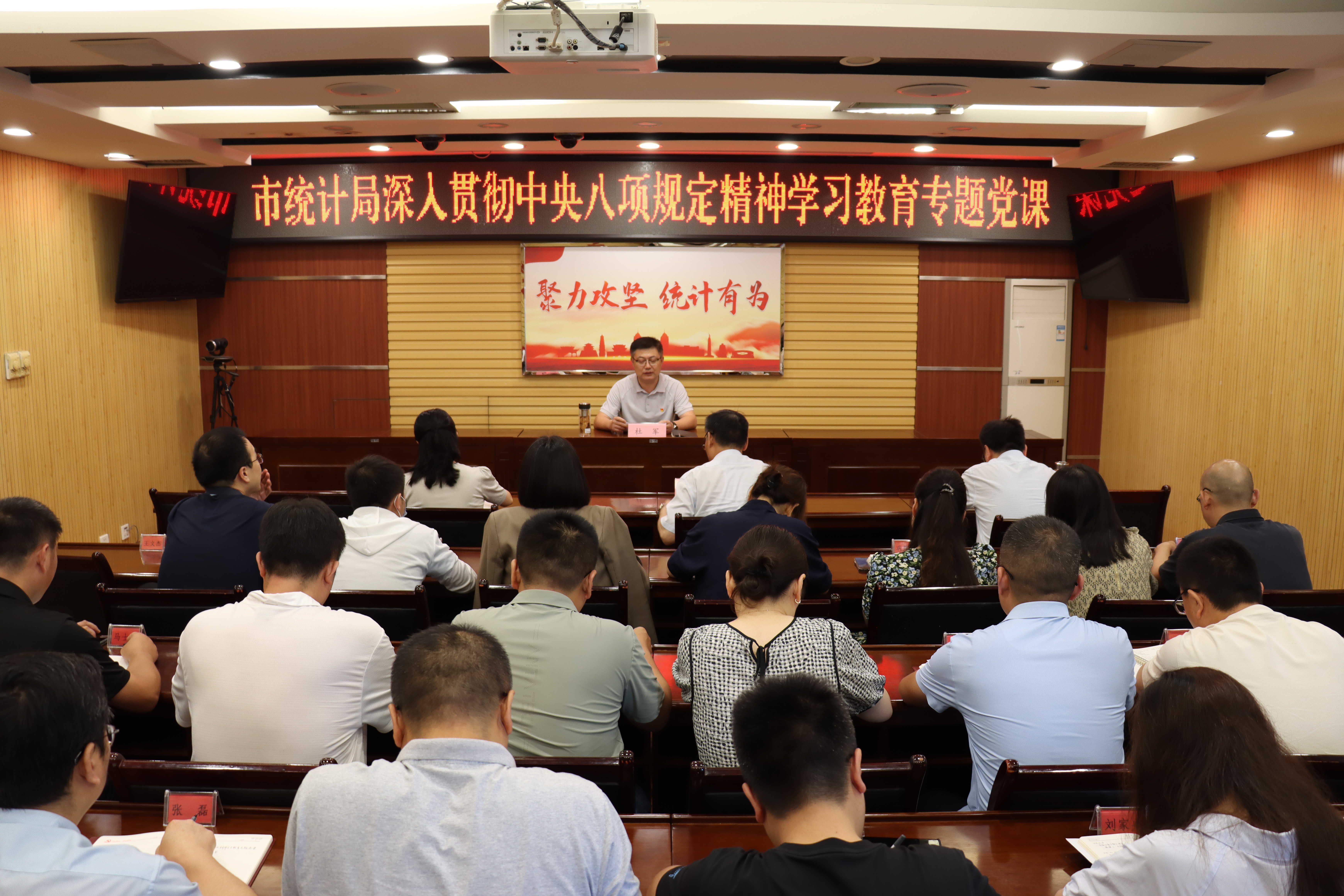 为深入贯彻落实中央八项规定精神,扎实推进全面从严治党,锤炼过硬统计作风,7月2日,枣庄市统计局党组书记、局长杜军以《锤炼过硬作风 护航数据真实 以中央八项规定精神引领统计事业高质量发展》为题,为全局党员干部讲授专题党课。局领导班子成员及全体干部职工参加学习。